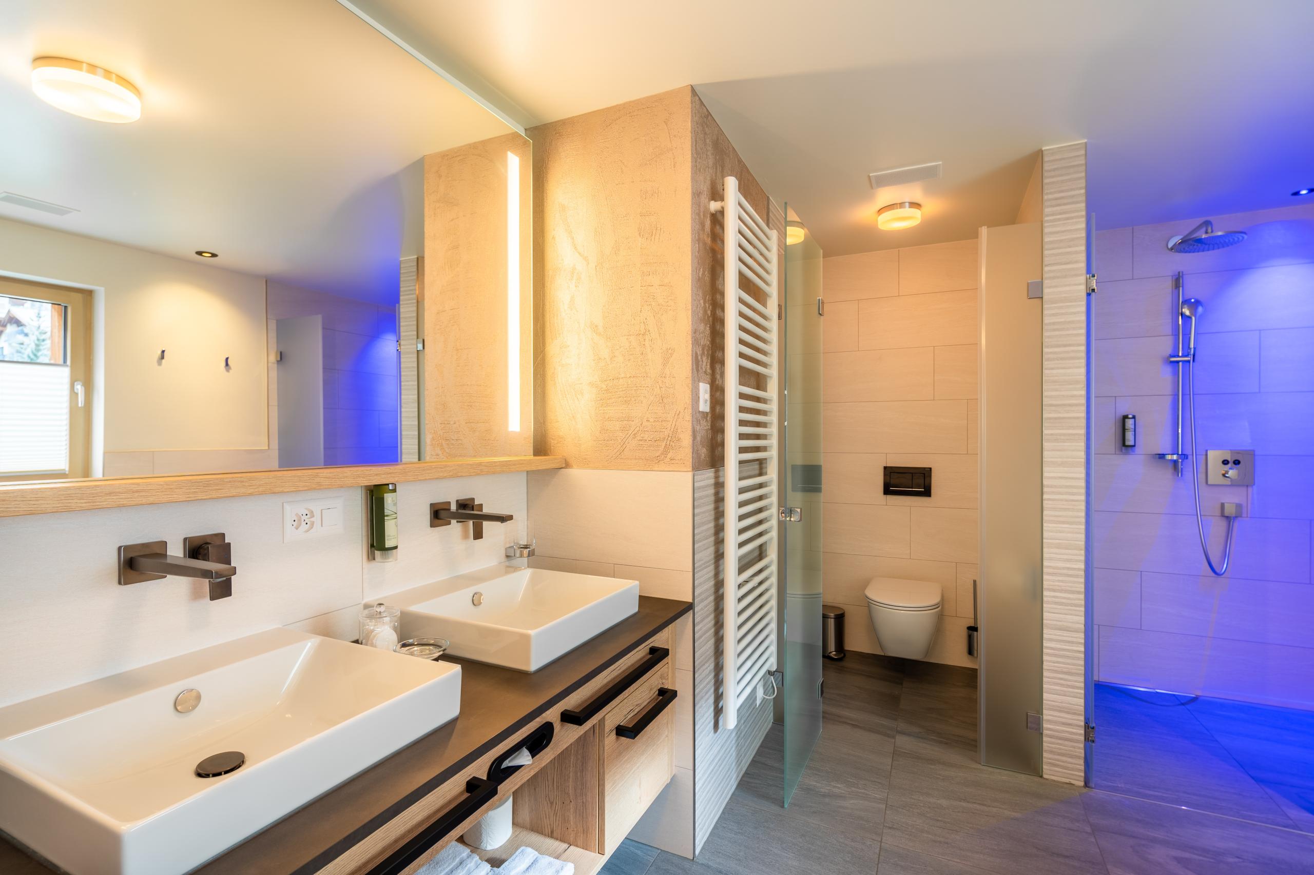 - Bathroom with freestanding bathtub, toilet, shower and double washbasin