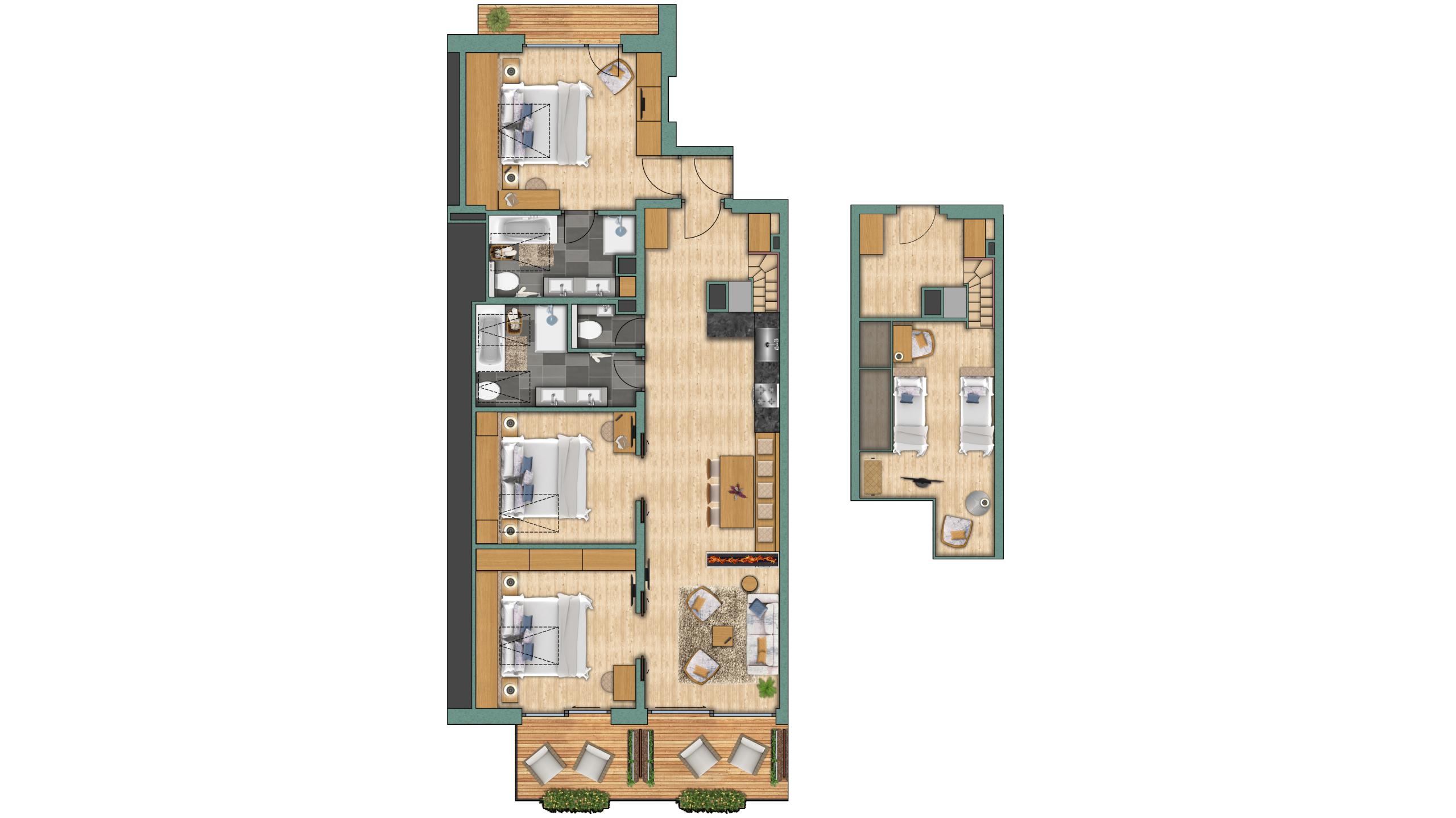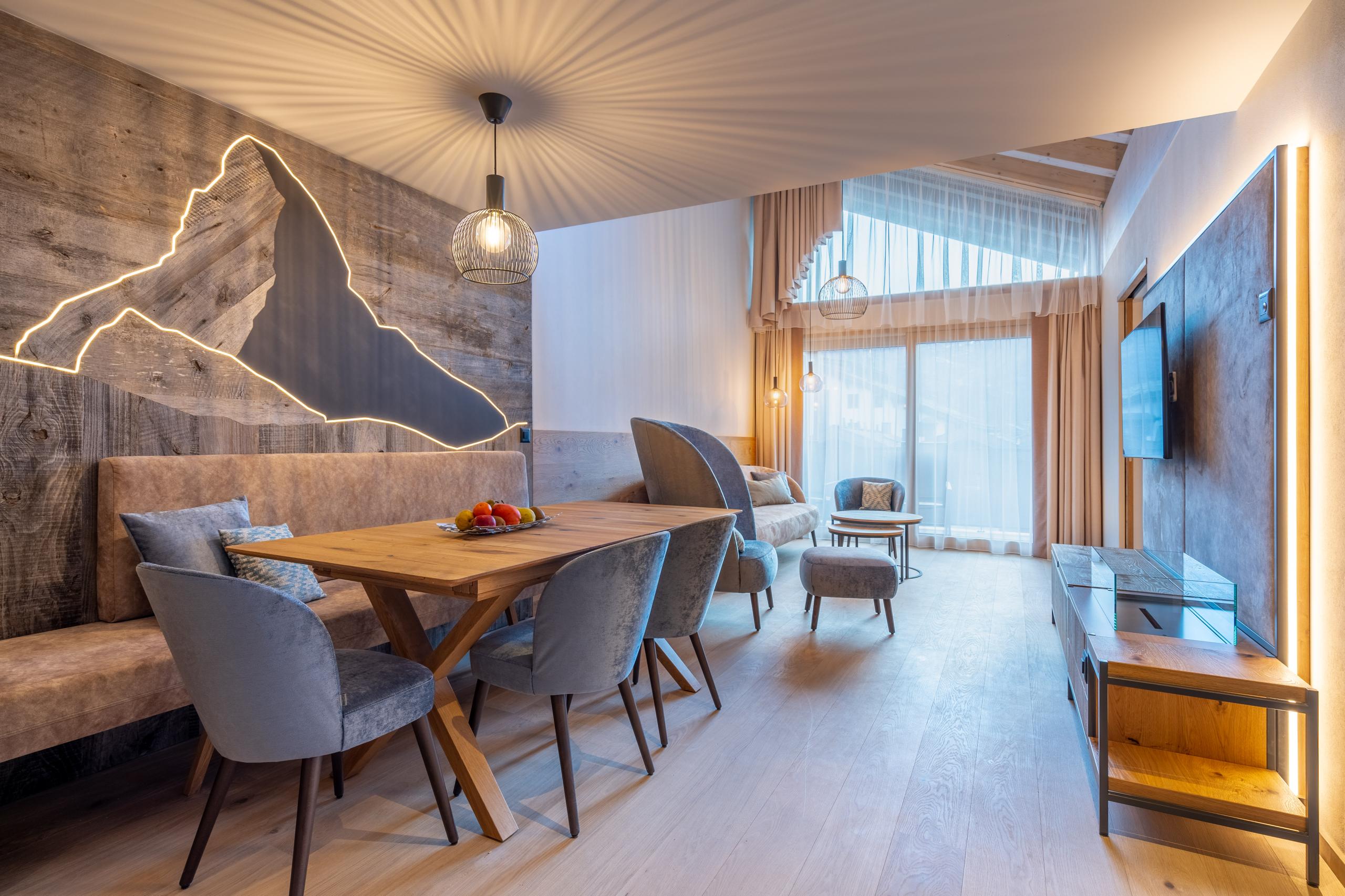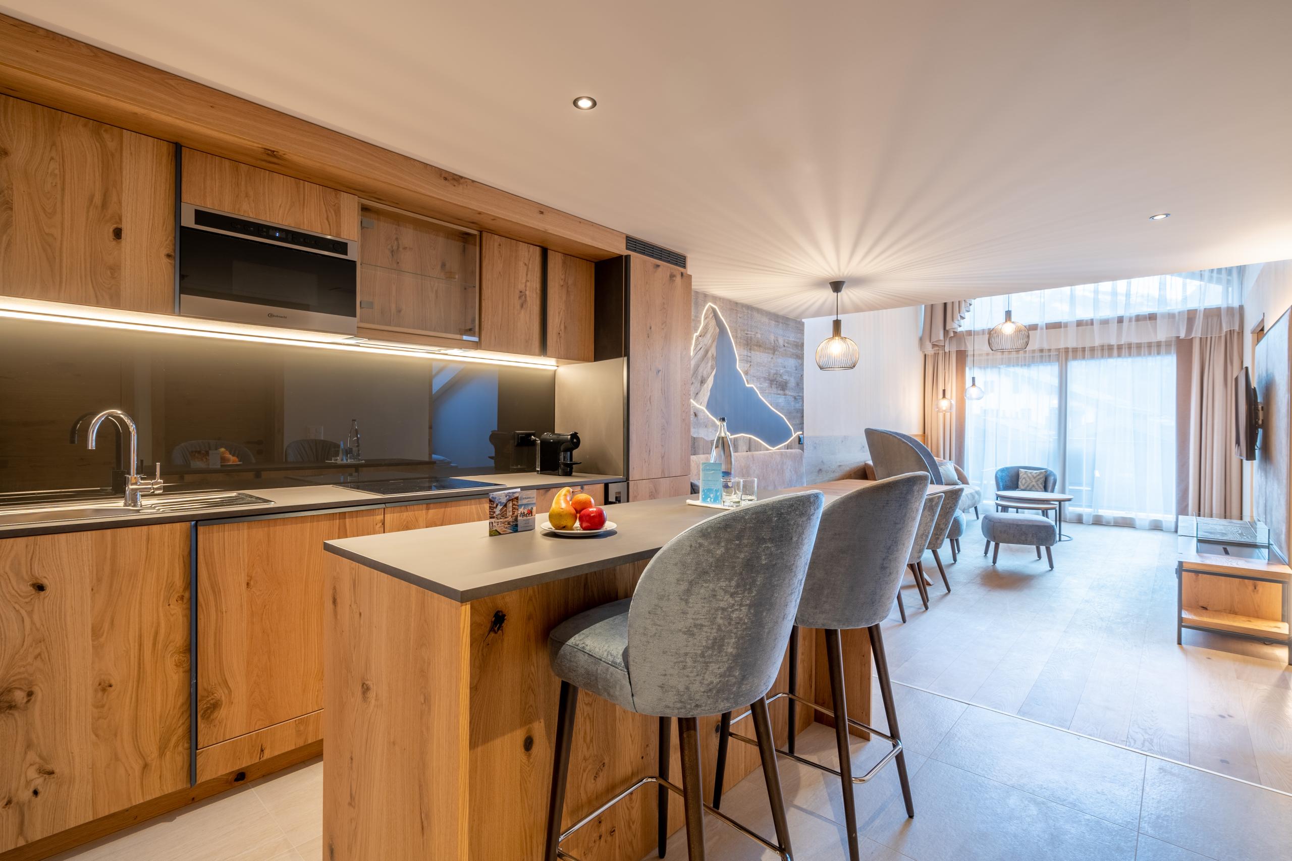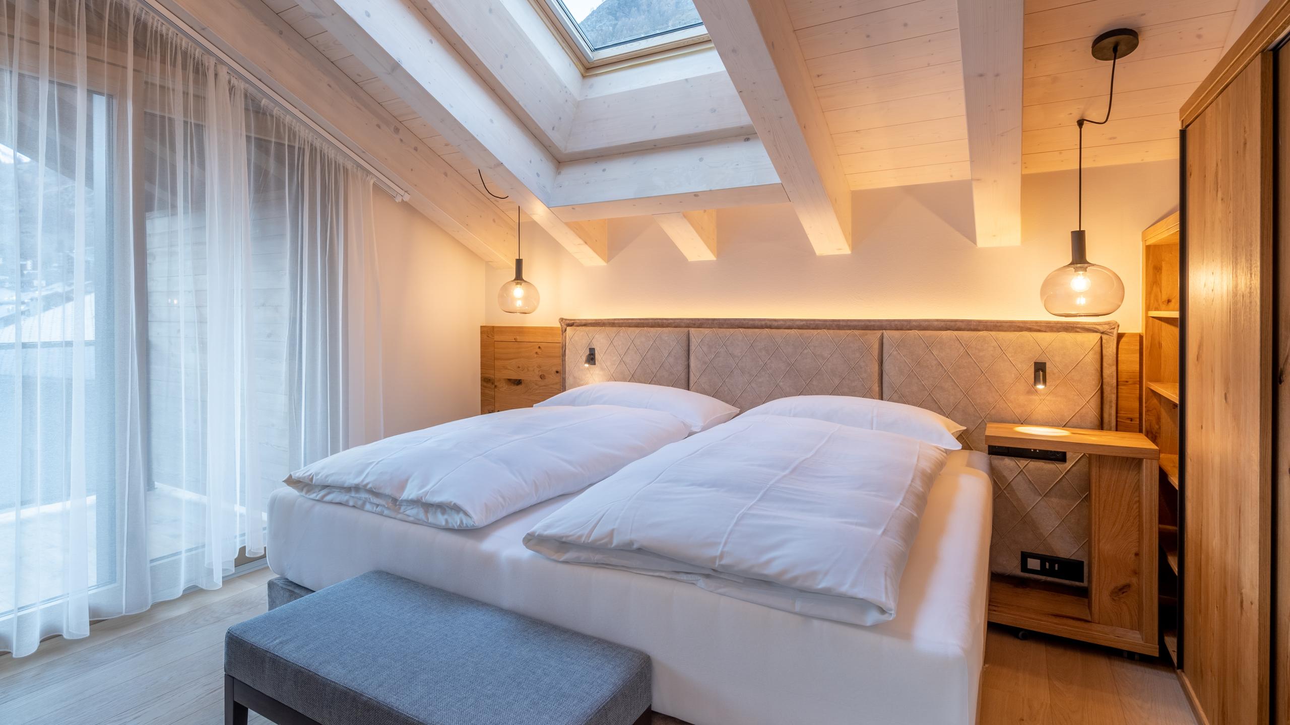 Comme son nom l’indique, la vue de cet appartement est légendaire. Dans cet appartement, vous vous trouvez au-dessus des toits de Zermatt, d’où vous avez non seulement une vue imprenable sur le Cervin, mais également sur tout le village. L’appartement "Zinalrothorn" View, meublé dans un style moderne et alpin, est situé au quatrième étage du Altiana by La Ginabelle. Il se compose de deux pièces avec porte communicante. Le point fort de l'appartement mansardé est, outre la vue, le plafond élevé et la façade vitrée du sol au plafond de 5 mètres de haut, orientée vers le Sud.