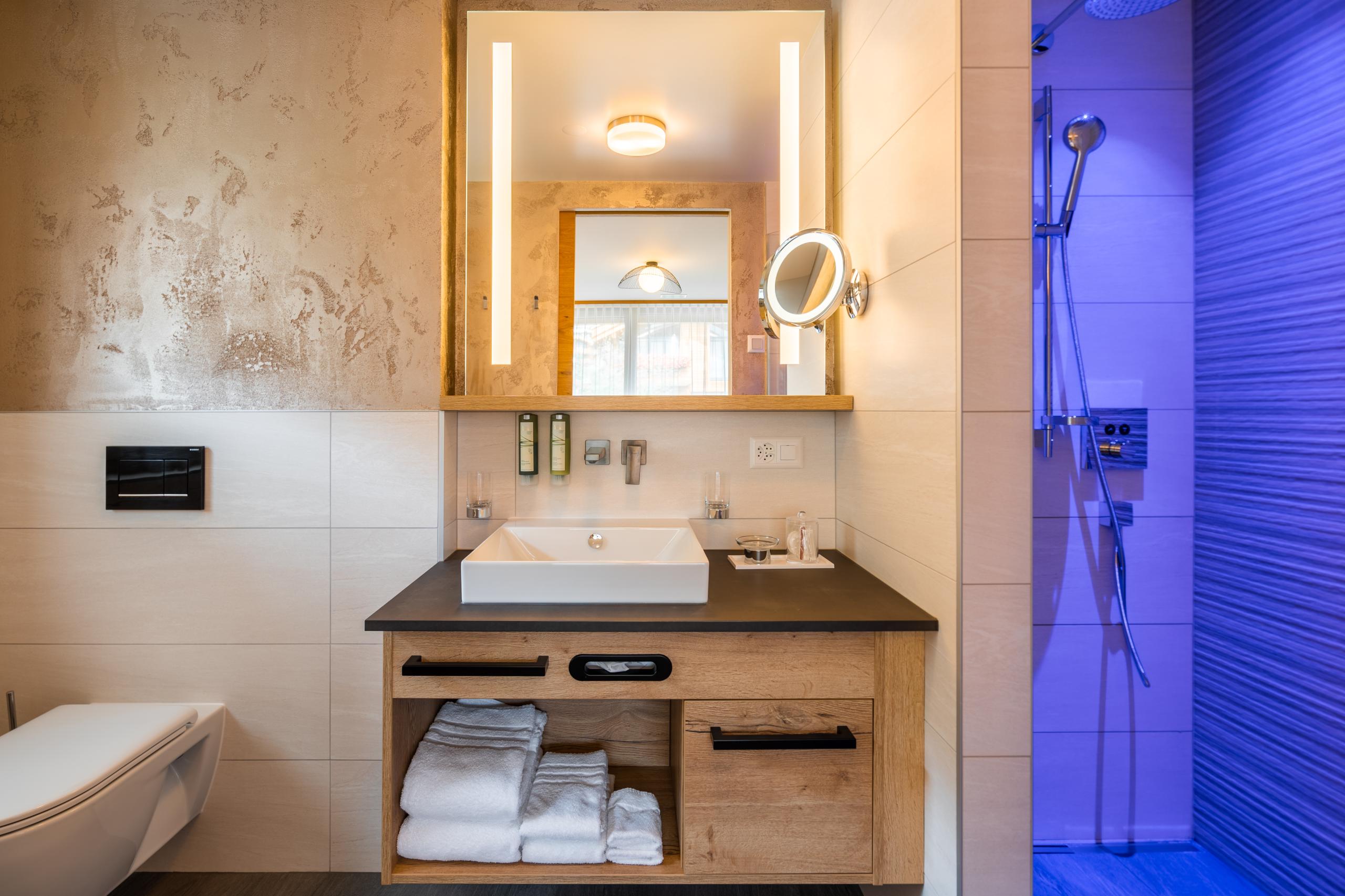 - Kosmetikspiegel, Handtuchwärmer, Haarföhn, Telefon, Radio, Minibar und Safe