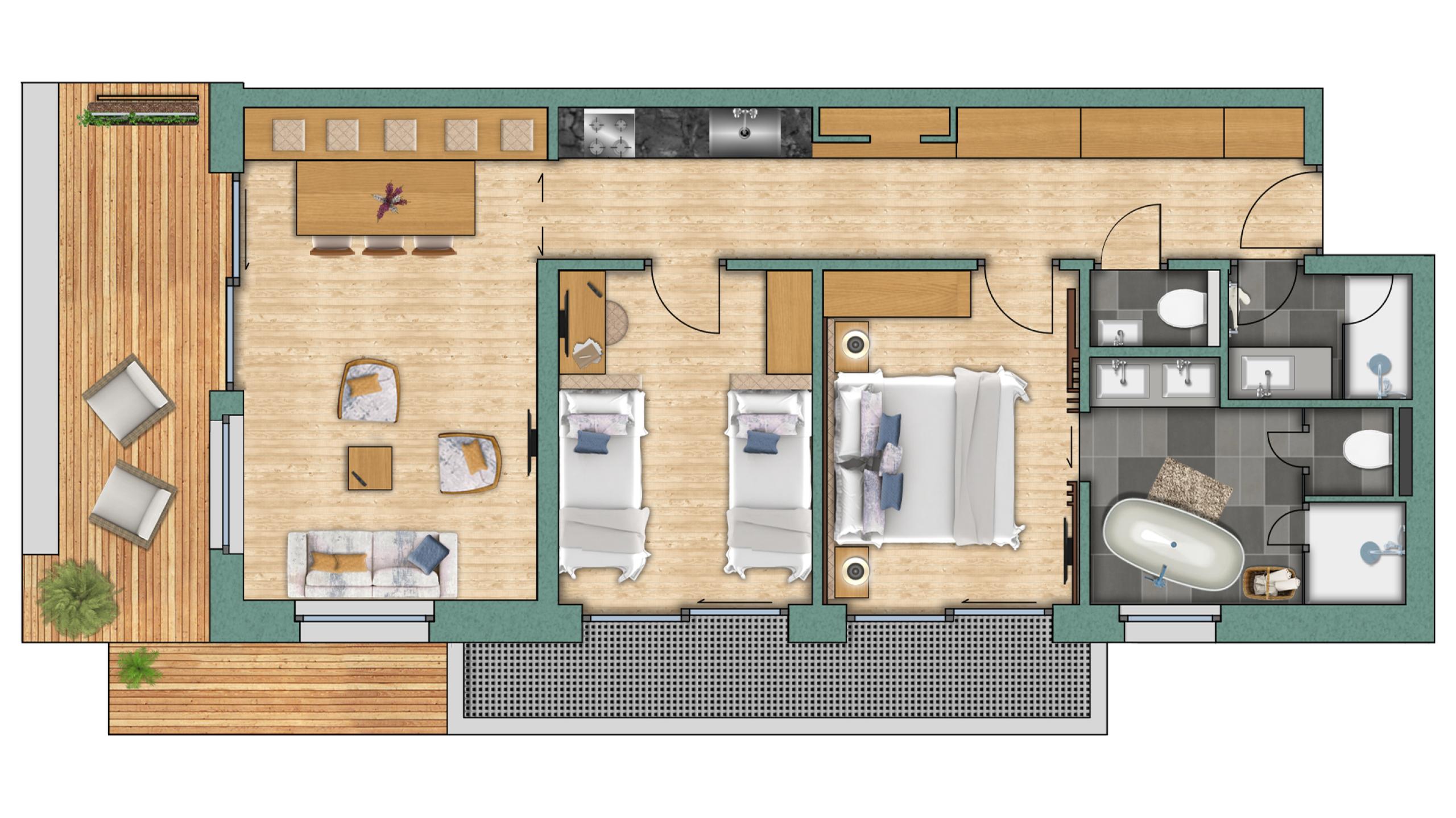 Das Appartement "Weisshorn" Komfort ist im modernen, alpinen Stil eingerichtet und befindet sich im ersten Stock des Altiana by La Ginabelle. Das Highlight des Eck-Appartements ist neben den beiden separaten Schlafzimmer der grosse Wohnbereich, sowie die bodenbündige Fensterfront Richtung Süden.
