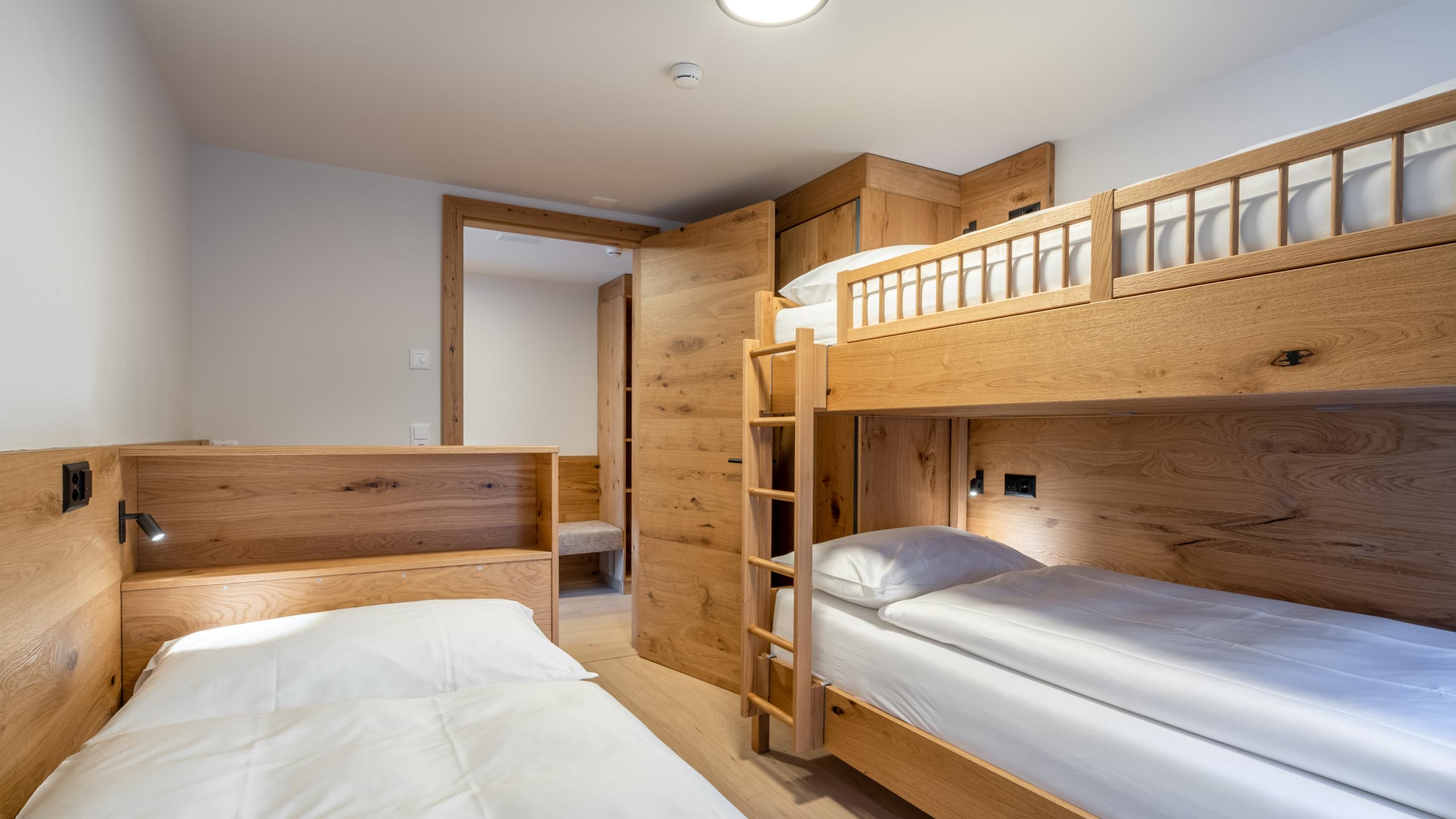 - Ein Boxspring Einzelbett und ein Etagenbett mit flauschiger Bettwäsche in separatem Zimmer mit Flachbild-TV und Zugang zum Balkon