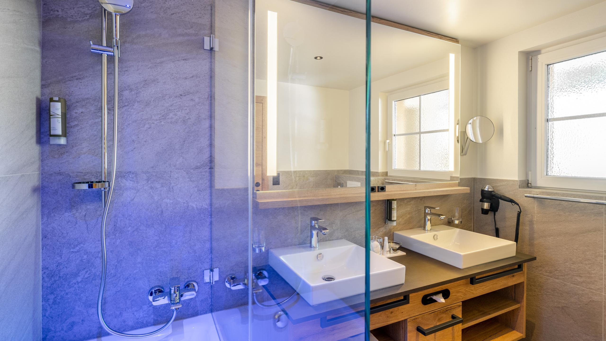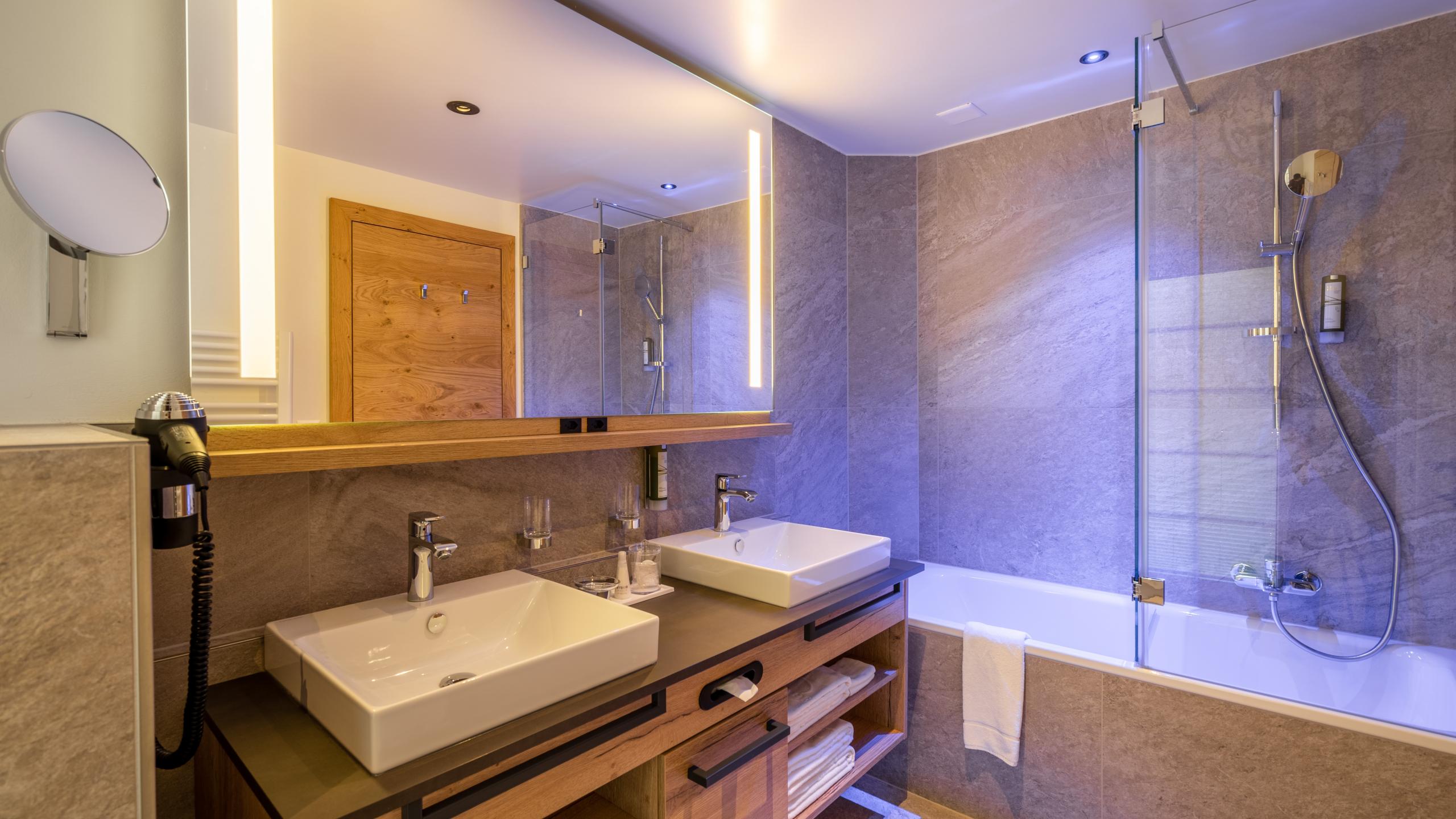 - Kosmetikspiegel, Handtuchwärmer, Haarföhn, Telefon, Radio, Minibar und Safe